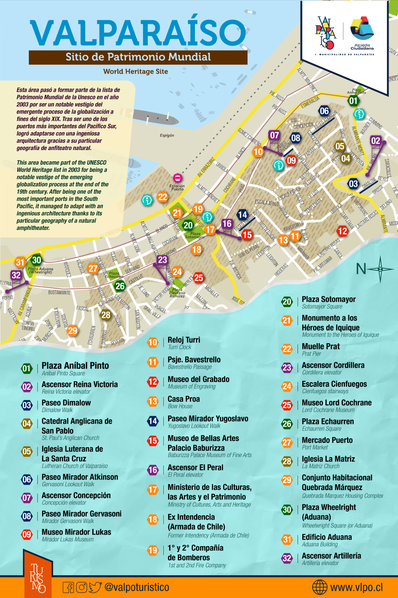 Parte del área histórica de la ciudad de Valparaíso se encuentra declarado por la UNESCO como Sitio de Patrimonio Mundial en el año 2003 por ser testimonio excepcional de la temprana globalización, cuando Valparaíso se convirtió en el puerto comercial líder de las rutas navieras de la Costa Pacífico de Sudamérica.